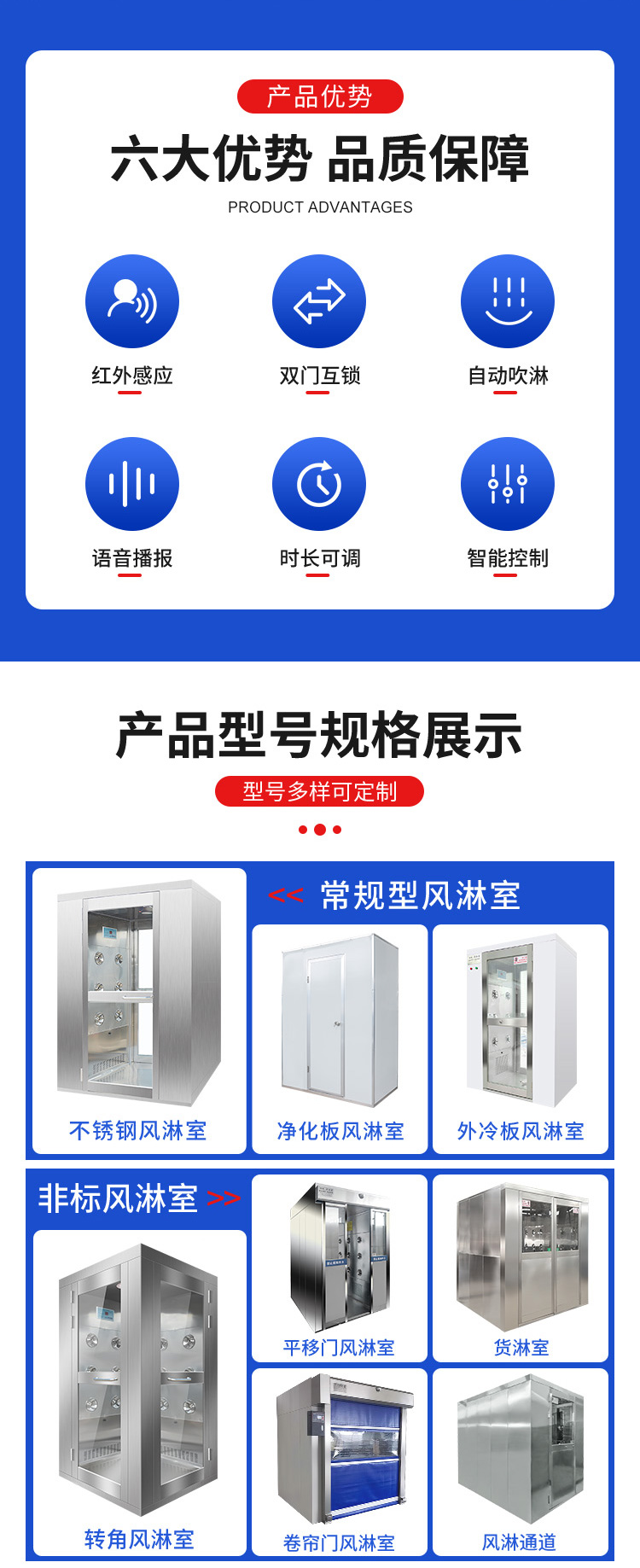 描述:风淋室是一种通用性较强的局部净化设备,安装于洁净室与非洁净室之间。当人与货物要进入洁净区时需经风淋室吹淋,其吹出的洁净空气可去除人与货物所携带的尘埃,能有效的阻断或减少尘源进入洁净区。
