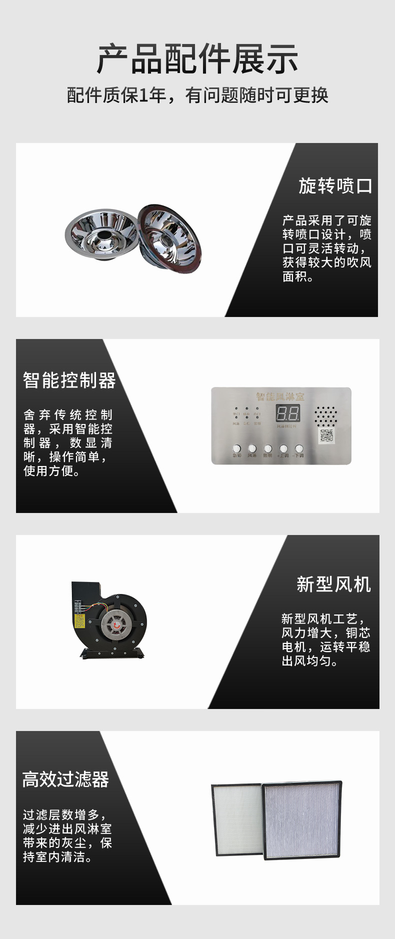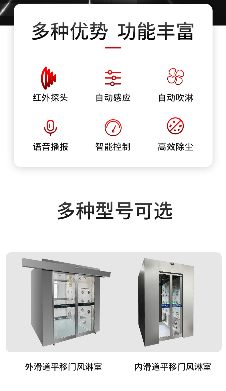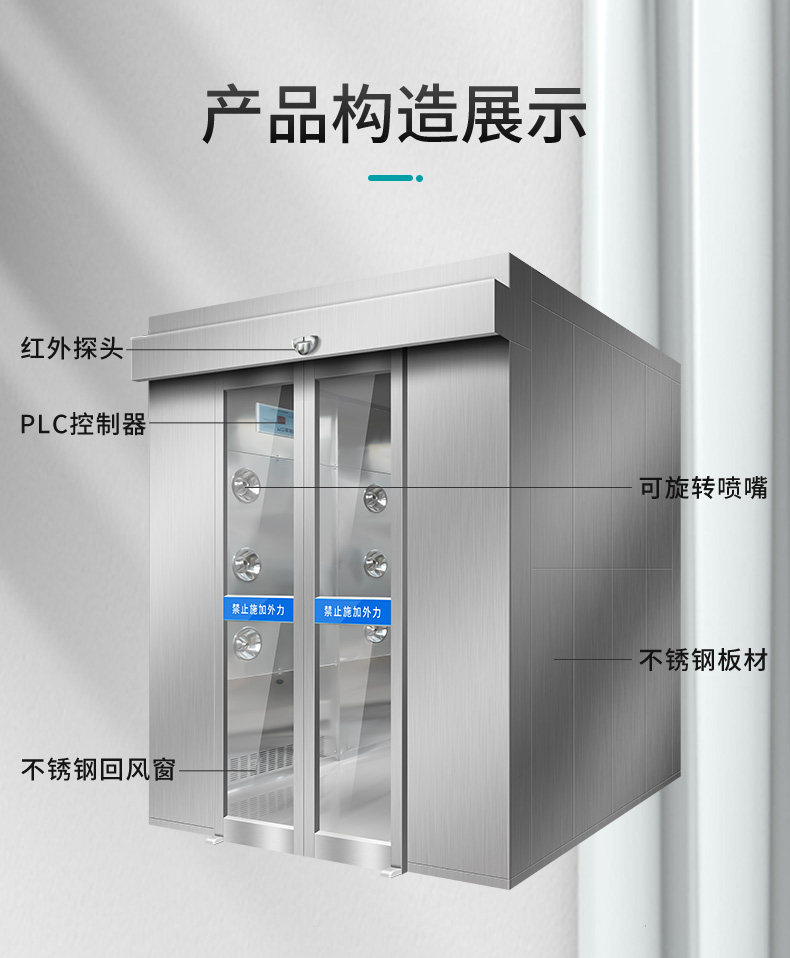 描述:平移门风淋室的前后两道门为电子互锁,通过感应装置开关,又可起到气闸的作用,阻止未净化的空气进入洁净区域。