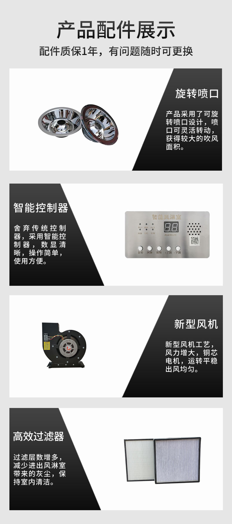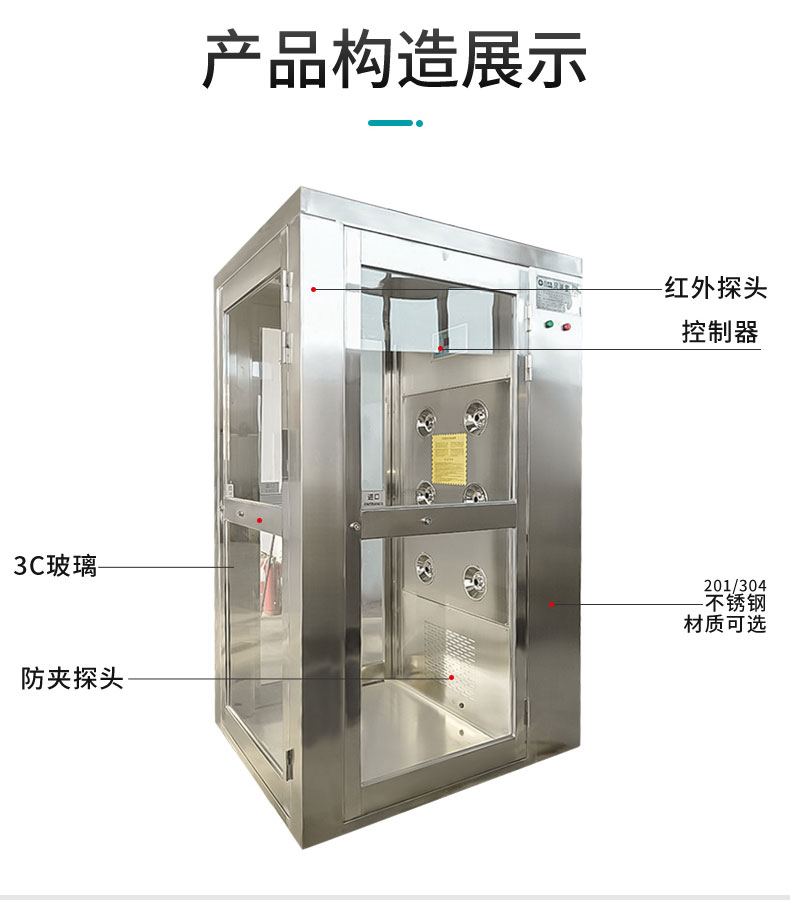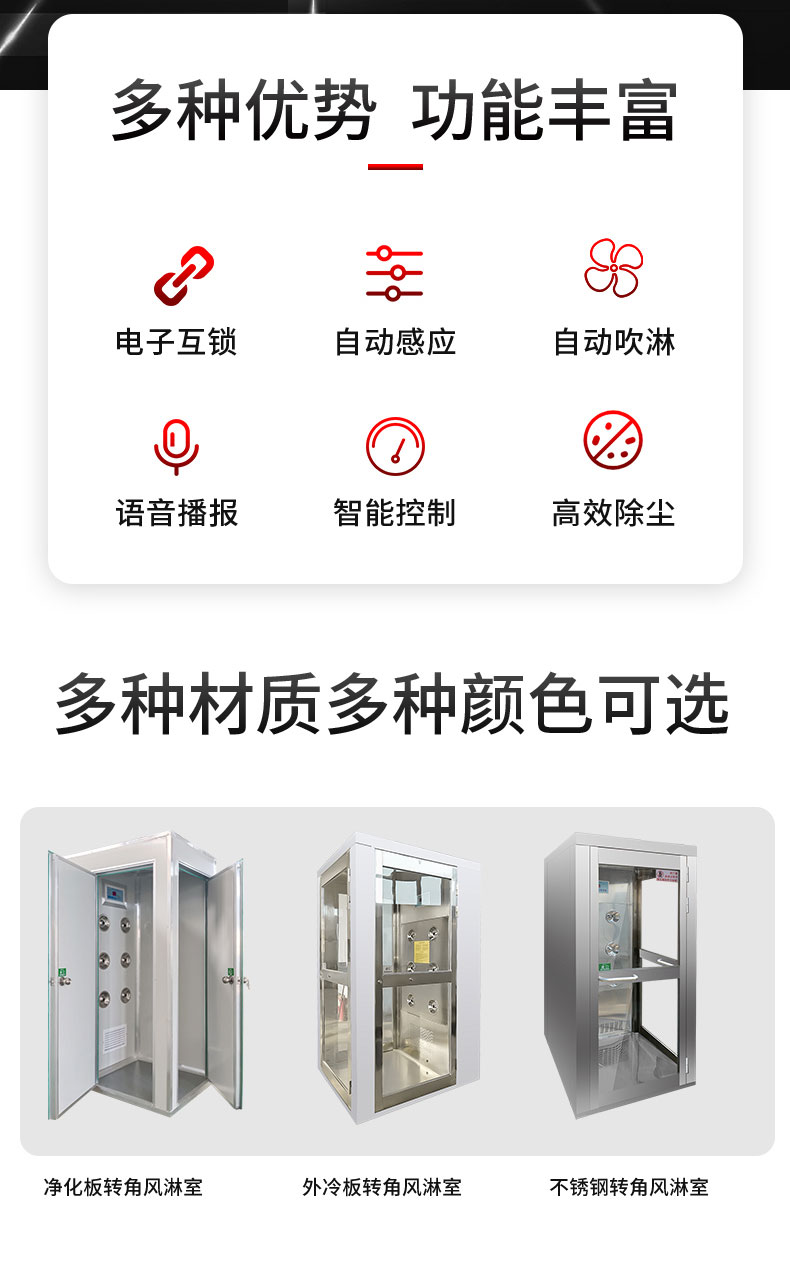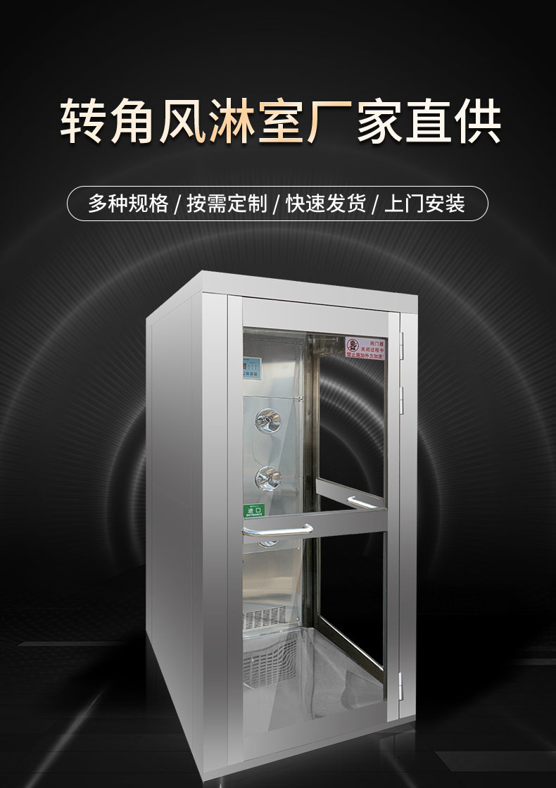 描述:转角风淋室感应自动吹淋,透明视窗,内部吹淋状况随时可见;软件试控制器,LED显示及设置吹淋时间,范围0~99秒可调,内部采用圆的渐开线风道,高风速,低噪音。