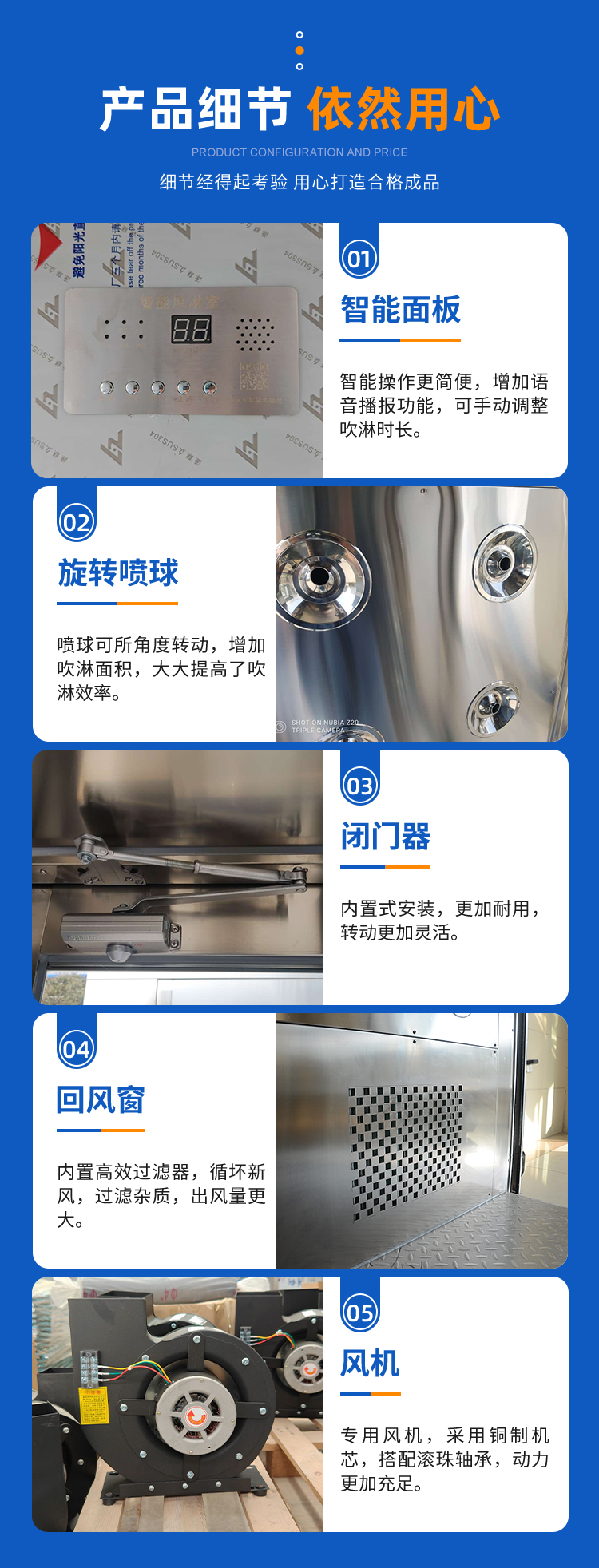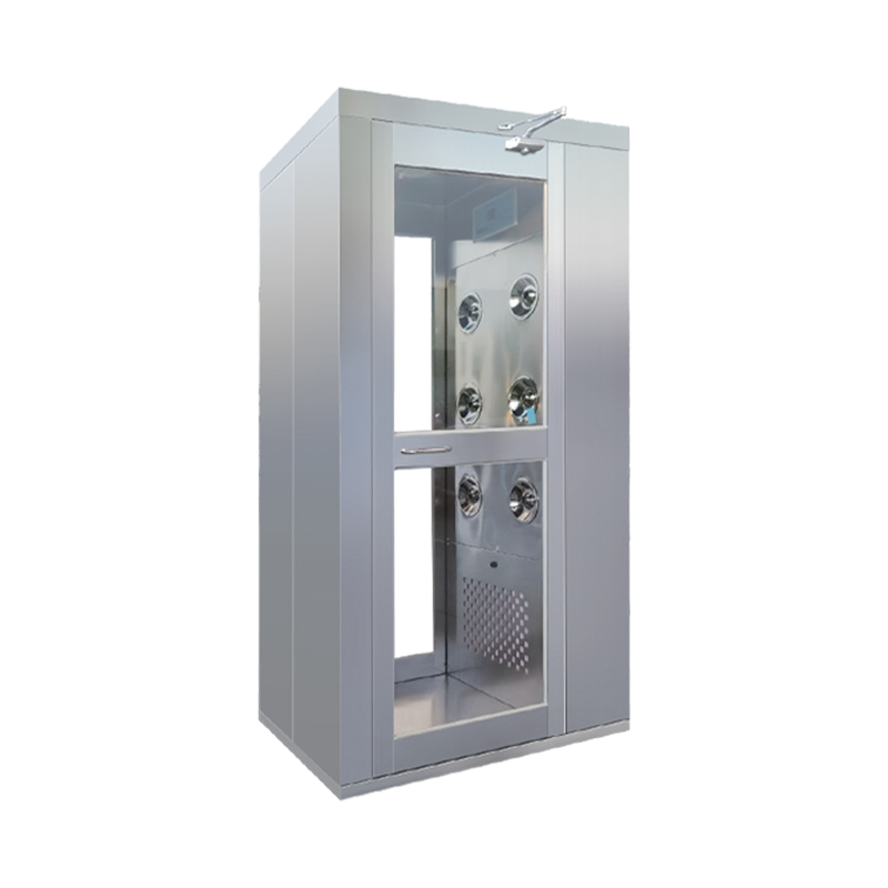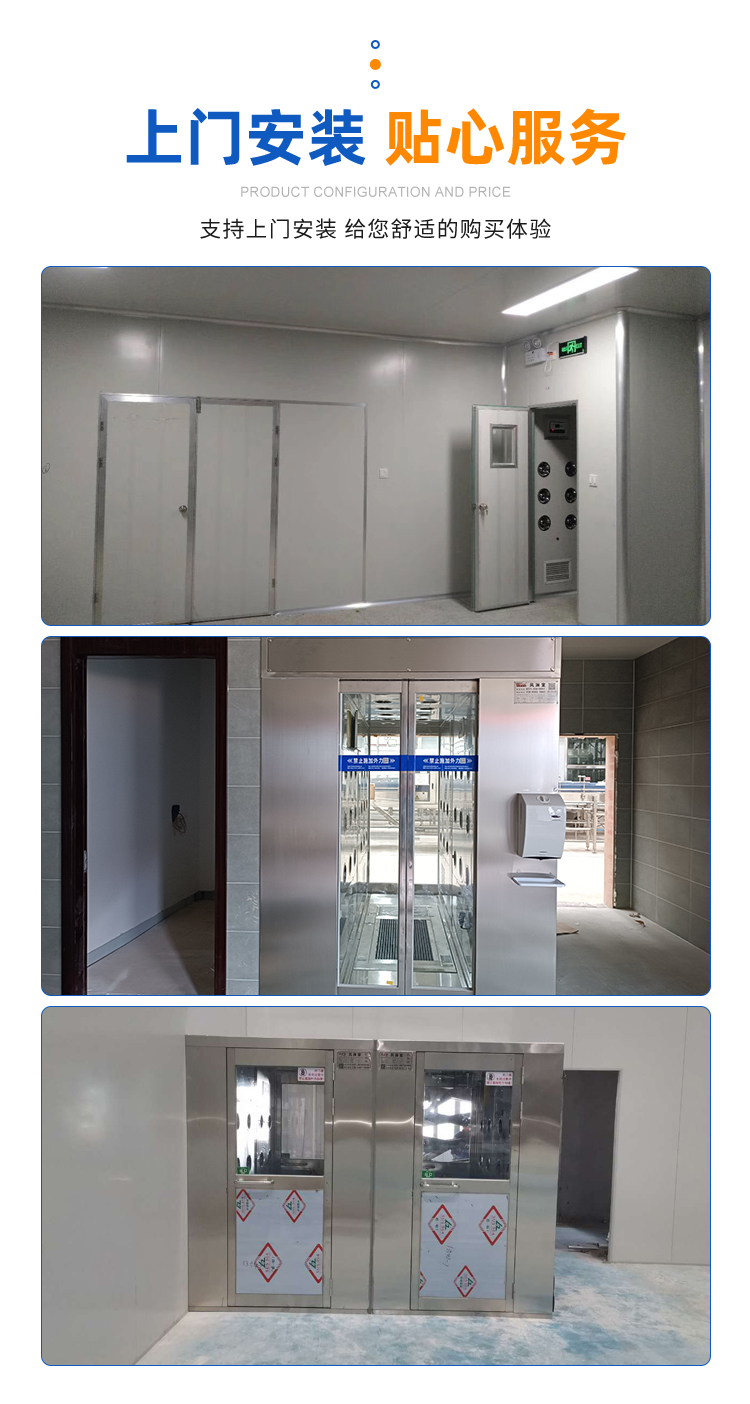描述:风淋室是人员或货物进入洁净区由风机通过风淋喷嘴喷出经过过滤的空气,吹除人或物体表面吸附尘埃的一种通用性的局部净化设备。